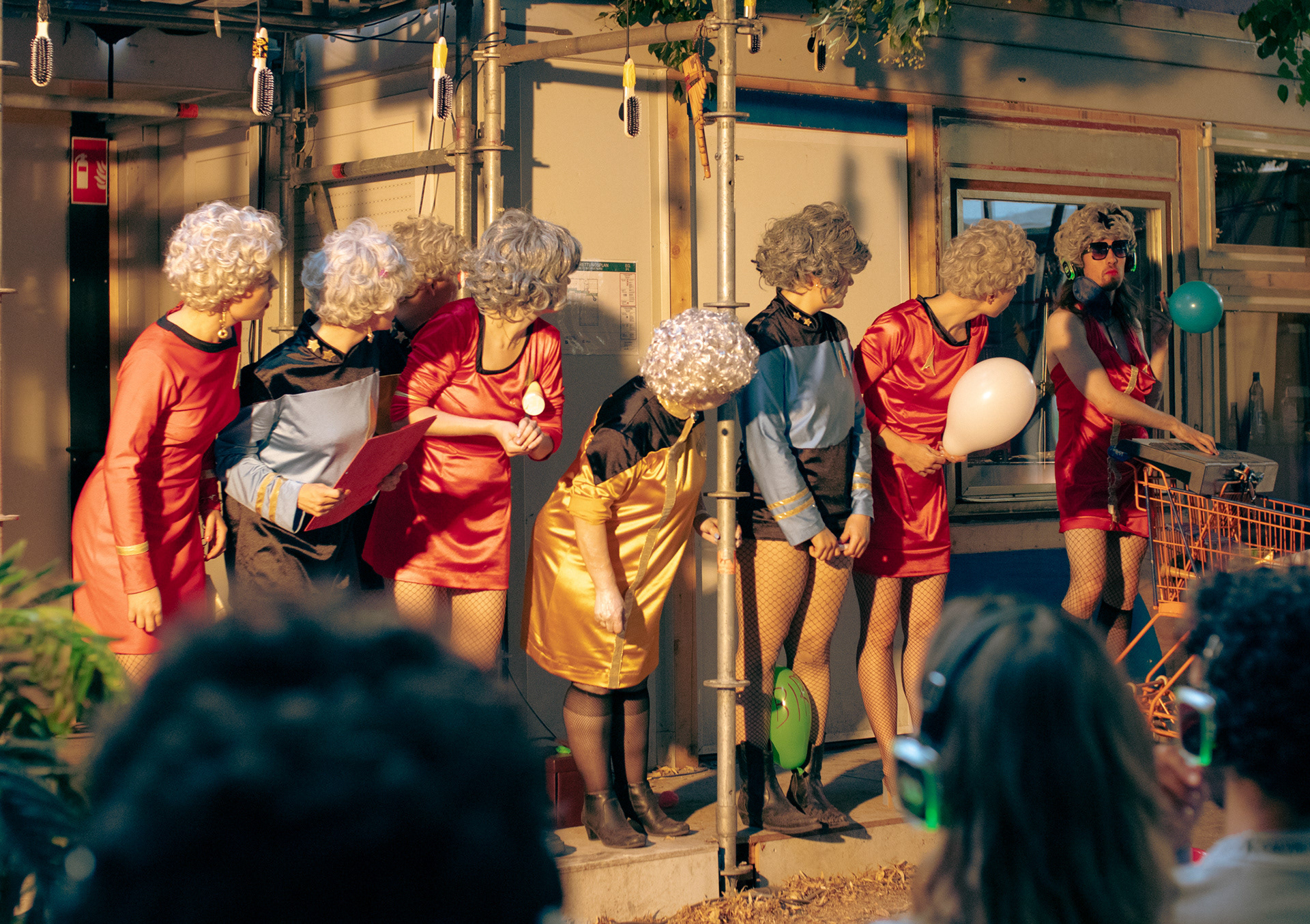 In WIR SIND NICHT NETT (Part 2), the self-proclaimed “Big Bang of Culture Club” moves its mobile production office into the container landscape in front of the Haus der Statistik. This time, they are coming together again to produce a flop. “What are we doing here again?” — “We've sold ourselves out,” says the text. “And what is our mission?” — “Good ideas.” So the club members conscientiously try to come up with these “What are we doing here again?” — “We sold ourselves,” the text says. “And what is our mission?” — “Good ideas.” So the club members conscientiously try to develop these good ideas. They put themselves in extreme situations through role-playing. "Maximum Ideas Come From Maximum Stress" — that's the credo of this somewhat desperate approach, which sometimes involves bullshit bingo with political phrases, a barbecue, "Maximum Ideas Comes From Maximum Stress" — that's the credo of this somewhat desperate approach, which has them playing bullshit bingo with political phrases, a barbecue, or a plane crash. The themes revolve around self-determination, isolation, competition, and self-expectations.
