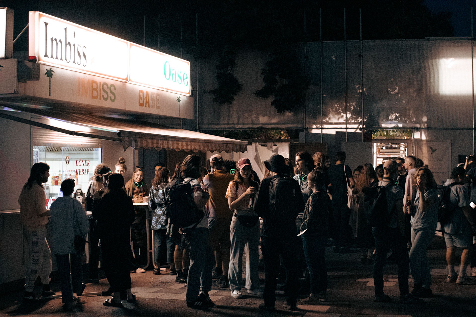 The front yard of Karl-Marx-Allee at night forms an open-air public space. Sitting on a lawn, the audience follows the action via wireless headphones, hanging unusually close to every breath of the performers. This creates a cinematic intimacy — but at the same time, a feeling of abstract deficiency.